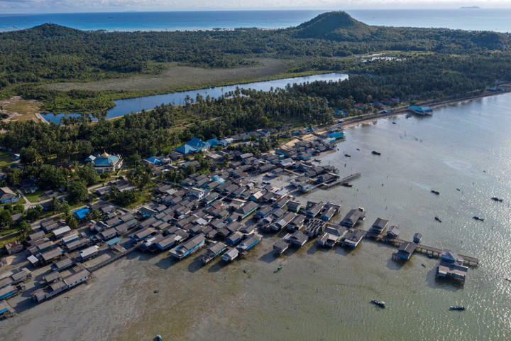 Natuna bersiap bergetar oleh deru senjata berat TNI. Yonkomposit 1/GP mengimbau warga tak beraktivitas di luar ruangan pada 22–24 Oktober 2025 saat latihan perang digelar. Foto udara permukiman warga dan embung air tawar di Desa Air Payang, Pulau Laut, Natuna, Kepulauan Riau.