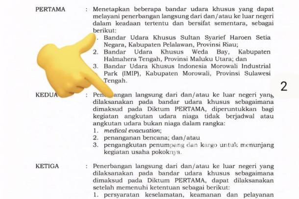 DIKTUM pertama aturan itu menjelaskan bahwa fasilitas internasional tersebut hanya berlaku untuk kegiatan penunjang operasi, seperti medical evacuation, penanganan bencana, dan pengangkutan penumpang maupun kargo berkaitan dengan usaha pokok. Dengan demikian, konsep “internasional” yang diberikan bukanlah akses bebas seperti bandara komersial, melainkan koridor terbatas yang tetap membutuhkan pengawasan ketat antarinstansi.
